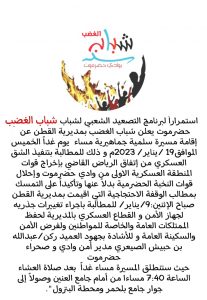 استمراراً لبرنامج التصعيد الشعبي لشباب الغضب بوادي حضرموت يعلن شباب الغضب بمديرية القطن عن إقامة مسيرة سلمية جماهيرية مساء اليوم الخميس الموافق19 /يناير/ 2023م و ذلك للمطالبة بتنفيذ الشق العسكري من إتفاق الرياض القاضي بإخراج قوات المنطقة العسكرية الاولى من وادي حضرموت وإحلال قوات النخبة الحضرمية بدلاً عنها وتأكيداً على التمسك بمطالب الوقفة الاحتجاجية التي اقيمت بمديرية القطن صباح الإثنين:9/يناير/ للمطالبة باجراء تغييرات جذريه لجهاز الأمن و القطاع العسكري بالمديرية لحفظ الممتلكات العامة والخاصة للمواطنين ولفرض الأمن والسكينة العامة و للأشادة بجهود العميد ركن/عبدالله بن حبيش الصيعري مدير أمن وادي و صحراء حضرموت