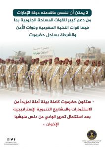 لن تنس حضرموت الأدوار والجهود والمواقف التاريخية التي يقوم بها الهلال الأحمر الإماراتي في حضرموت، وما وقوفه إلى جانب الأهالي في أزماتهم المتفاقمة نتيجة تداعيات الحرب الظالمة إلا تعبيرا عن عروبة متأصلة وأخلاق رفيعة طالما اتصف بها الأخوة الإماراتيين قيادة وشعبا، وهذا ليس غريبا على الأشقاء في دولة الإمارات العربية المتحدة الذين يشهد لهم كل منصف وحكيم.