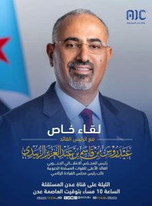 ترقبوا الليلة #لقاء_خاص مع الرئيس القائد عيدروس بن قاسم الزُبيدي، رئيس المجلس الانتقالي الجنوبي القائد الأعلى للقوات المسلحة الجنوبية نائب رئيس مجلس القيادة الرئاسي على قناة #عدن_المستقلة الساعة العاشرة مساء بتوقيت العاصمة عدن
