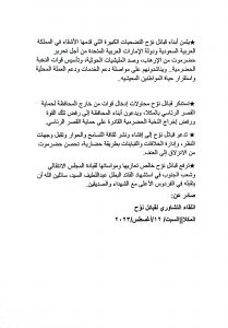 ★يثمن أبناء قبائل نوّح التضحيات الكبيرة التي قدمها الأشقاء في المملكة العربية السعودية ودولة الإمارات العربية المتحدة من أجل تحرير حضرموت من الإرهاب، وصد المليشيات الحوثية، وتأسيس قوات النخبة الحضرمية.. ويناشدونهم على مواصلة دعم الخدمات ودعم العملة المحلية واستقرار حياة المواطنين المعيشيه..