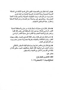 مؤكدا حق أبناء حضرموت في إقامة إقليمهم الذاتي ضمن الدولة الجنوبية الفيدرالية، الذي تدار جميع موارده من قبل أبنائه، وناشد ت قبائل نوّح دول التحالف العربي لمساعدة أبناء المحافظة، وتحقيق مطالبهم في إخراج قوات المنطقة العسكرية الأولى، وتمكين قوات النخبة من السيطرة على كامل التراب الحضرمي، ومواصلة دعم الخدمات ودعم العملة المحلية واستقرار حياة المواطنين المعيشيه.. مثمنين التضحيات الكبيرة التي قدمها الأشقاء في المملكة العربية السعودية ودولة الإمارات العربية المتحدة من أجل تحرير حضرموت من الإرهاب، وصد المليشيات الحوثية، وتأسيس قوات النخبة الحضرمية..