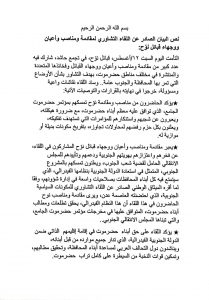 وصدر عن اللقاء بيان صحفي، أكدت فيه قبائل نوح تمسكها بمؤتمر حضرموت الجامع، الذي توافق عليه معظم أبناء حضرموت، ومطالبتها بهيكلته، وعبرت عن شجبها واستنكارها للمؤامرات التي تستهدف تفكيكه، معلنة رفضها بكل حزم لمحاولات تجاوزه، بتفريخ مكونات بديلة أو موازية له.