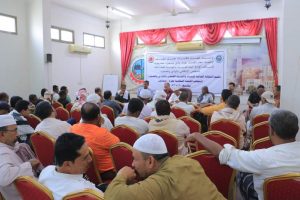 اللقاء الانتخابي الذي استهل بتلاوة آيات من الذكر الحكيم، بعد ذلك ألقى الأستاذ / سالم سعيد قمصي رئيس الاتحاد العام لعمال نقابات وادي وصحراء حضرموت أكد أهمية العمل النقابي بين أوساط العاملين في مواقع العمل والإنتاج والاستناد إلى النظم واللوائح لسير العملية الانتخابية بطريقة سليمة.