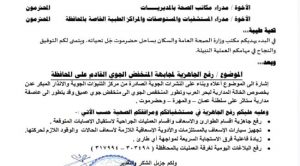 أصدر مكتب وزارة الصحة العامة والسكان بحضرموت الساحل تعميما هام الى مدراء مكاتب الصحة بالمديريات والمستشفيات والمرافق الصحية العامة والخاصة لرفع درجة الجاهزية لمجابهة الحالة المدارية خلال الأيام القادمة مابين ٢٣الى٢٥ أكتوبر من الأسبوع الجاري وفقا لما ورد في النشرة الصادرة من مركز التنبؤات الجوية والإنذار المبكر بحضرموت.
