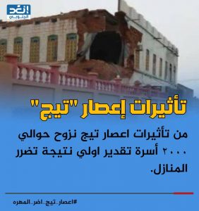 وقالوا: “تسبب إعصار تيج في انقطاع تام للتيار الكهربائي وأزمة في مستلزمات الإيواء والوقود، ونزوح حوالي ٢٠٠٠ أسرة كتقدير أولي نتيجة لتضرر المنازل”.