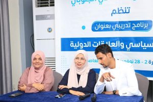 وتناول التدريب الذي نفذه في اليوم الأول استاذ العلاقات الدولية البروفسور ايمن يوسف عبر تقنية الاتصال المرئي، عددا من المحاور التدريبية منها مدخل العلاقات الدولية، والسياسية الدولية ومناهجها، والسياسة الخارجية، والمفاوضات والوساطات، حيث جرى خلال التدريب اسقاط مبادئ العلاقات الدولية وعدد من الأمثلة على قضية الجنوب، والتطرق إلى أهمية المعاهدات والتحالفات الدولية، والتوازنات في السياسة الخارجية والحلول السياسية للقضايا الوطنية.