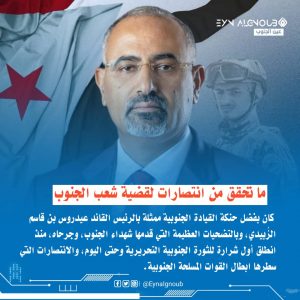 كما أكدوا على أن المجلس الانتقالي الجنوبي ممثل بالرئيس القائد عيدروس الزُبيدي، يسعى بكل قوة إلى تعزيز علاقاته السياسية (محليًا، وعربيًا، وإقليميًا، ودوليًا، وعالميًا)، وكذا تعزيز قدراته العسكرية بما يمكنه من الحفاظ على المنجزات التي تحققت، وحماية الجنوب من الأطماع الحوثية والجماعات الإرهابية، التي تنتظر الفرصة السانحة للانقضاض على الجنوب وشعبه.