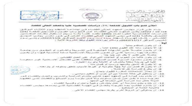 وأكد أن الاعلان جاء بناء على قرار مجلس المعهد العالي للقضاء في اجتماعه المنعقد يوم الثلاثاء الموافق 18- 10- 2022م وبموافقة مجلس القضاء الاعلى