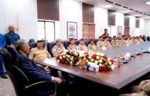 وترأس الرئيس القائد بعدها، اجتماعا لقيادة وزارة الدفاع، ورؤساء دوائر الوزارة، والضباط الدارسين، هنأ في مستهله الجميع بافتتاح هذا الصرح الأكاديمي الكبير، مؤكدا أن هذا الافتتاح، يمثل خطوة أولى نحو إعادة الحياة للأكاديمية العسكرية العُليا، وتأهيل القيادات العسكرية، الذين يقع على عاتقهم بناء وتطوير القوات المُسلحة بصنوفها الثلاثة قوات برية، وقوات بحرية، ودفاع جوي، على المستويات التكتيكية، والاستراتيجية، والتعبوية.