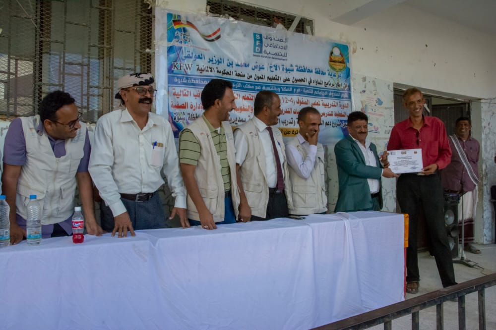 اختتمت بمديرية نصاب بمحافظة شبوة برامج التدريبات التربوية في مجال التعليم النشط والتي نظمها الصندوق الاجتماعي للتنمية فرع المكلا لمدة تسعة عشر يوما ، كرست لتعزيز بناء قدرات خمسمائة وثمانية وسبعين معلما ومعلمة للصفوف من اربعة الى اثني عشر بمدارس التعليم الاساسي والثانوي بالمديرية و المتعاقدين مع الصندوق ومكتب التربية والتعليم بالمديرية للعام الدراسي الحالي .