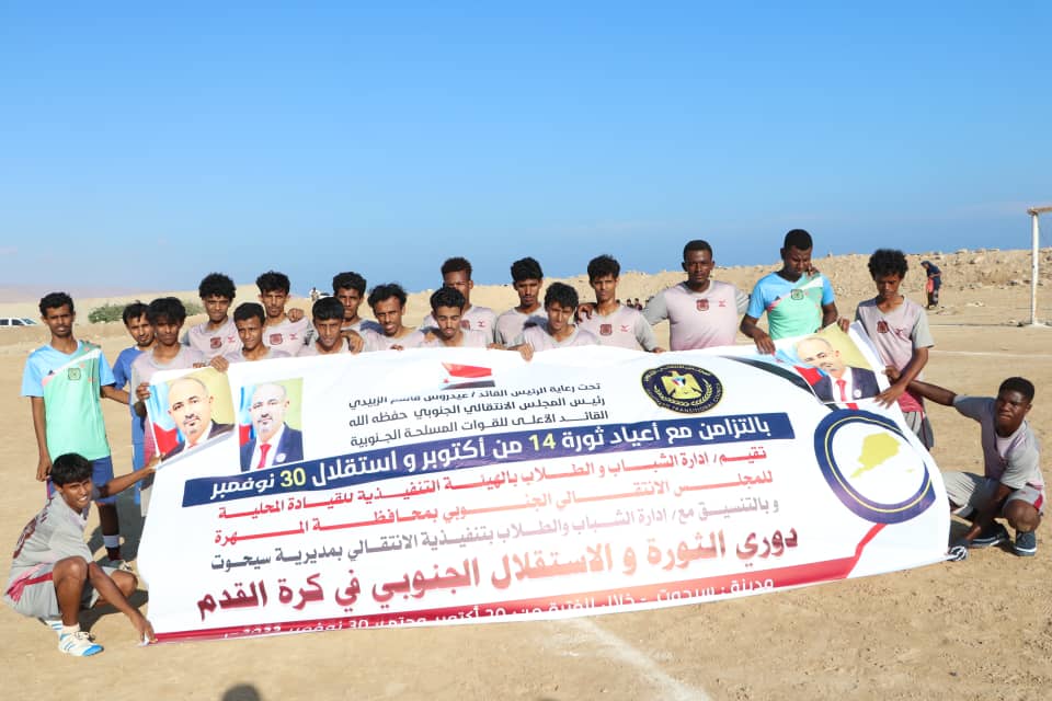 انطلقت بمديرية سيحوت محافظة المهرة عصر يوم امس السبت، بطولة دوري الأعياد الوطنية الجنوبية ال 14 من أكتوبر و ال30 من نوفمبر الكروية برعاية كريمة من الرئيس القائد/ عيدروس قاسم الزُبيدي رئيس المجلس الانتقالي الجنوبي والتي تنظمها إدارة الشاب والطلاب بالهيئة التنفيذية بانتقالي المحافظة والمديرية.