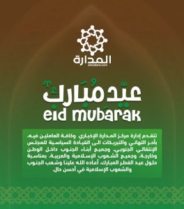 تتقدم إدارة مركز المدارة الإخباري وكافة العاملين فيه، بأحر التهاني والتبريكات الى القيادة السياسية للمجلس الإنتقالي الجنوبي، وجميع أبناء الجنوب داخل الوطن وخارجة، وجميع الشعوب الإسلامية والعربية، بمناسبة حلول عيد الفطر المبارك، أعاده الله علينا وشعب الجنوب والشعوب الإسلامية في أحسن حال.