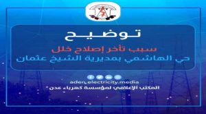 أصدرت المؤسسة العامة لكهرباء العاصمة عدن، توضيح بشأن تأخر اصلاح الخلل في كابل الضغط العالي في حي الهاشمي بمديرية الشيخ عثمان.