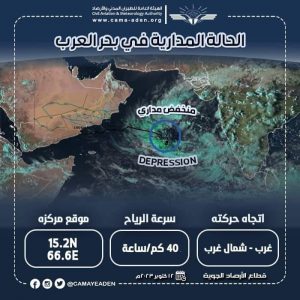وأكد أن صور الأقمار الصناعية أشارت أيضاً إلى أن أقصى رياح استمرت لأكثر من 10 دقائق مصاحبة للنظام وصلت إلى 20 عقدة تقريباً 40 كم/ساعة، والضغط الجوي عند مركز المنخفض المداري (15.2N 66.66E) المقدر هو 1003 هكتوباسكال.