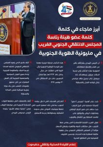 وإن احتفالنا بهذه الذكرى الخالدة، إنما يزيدنا إصرارا على مواصلة معركة التحرر الوطني والبناء المشترك بين كل محافظات الجنوب ال ثمان، على قاعدة تعزيز الهوية الوطنية الجنوبية الجامعة. وفي كل مرحلة من عملنا هذا، كنا ولا نزال نستلهم الدروس من شعبنا ومن أشقائنا في التحالف العربي الذي سطر مواقف عربية وإنسانية عظيمة، وأسقط من خلالها ثقافة الحروب وغزو الجنوب وباتت مواقفه منارة للأمل والحرية والسيادة الوطنية الجنوبية.