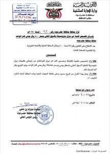 ولما تقتضيه المصلحة العامة مادة (1): تخصيص كمية ثلاثمائة وخمسون الف لتر ديزل للمواطنين من إجمالي كميات ديزل بترومسيلة لتغطية السوق المحلي بشكل يومي وبسعر ثمانمائة ريال يمني للتر الواحد ويتم التوزيع وفق آلية تضبط ذلك.