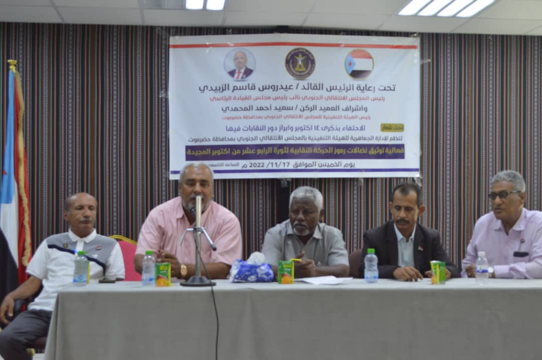 نظمت الإدارة الجماهيرية بالهيئة التنفيذية للقيادة المحلية للمجلس الانتقالي الجنوبي بمحافظة حضرموت، ندوة بعنوان “توثيق اسهامات الحركة النقابية الجنوبية في ثورة ١٤ أكتوبر”.