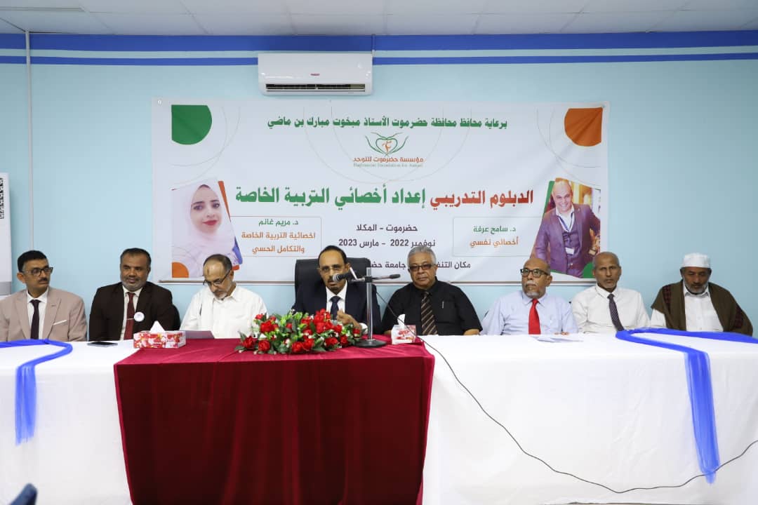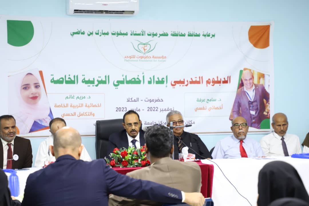 دشن محافظ حضرموت الأستاذ مبخوت مبارك بن ماضي، اليوم بمركز جامعة حضرموت لتدريب الطلاب بالمكلا، الدبلوم التدريبي لإعداد التربية الخاصة لمعلمات التوحّد.