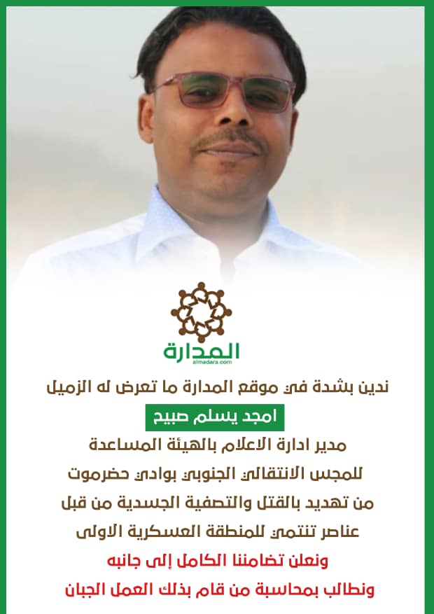 ندين بشدة في موقع المدارة ماتعرض له الزميل امجد صبيح مدير ادارة الاعلام بالهيئة التنفيذية المساعدة للمجلس الإنتقالي الجنوبي بوادي حضرموت من تهديد بالقتل والتصفية الجسدية من قبل عناصر تنتمي للمنطقة العسكرية الأولى