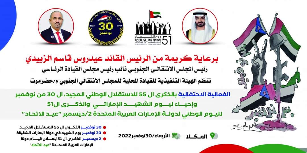 استعدادات مكثفة في حضرموت لإحياء عيد الاستقلال الجنوبي ويوم الشهيد الاماراتي واليوم الوطني لدولة الإمارات العربية المتحدة عيد الاتحاد.