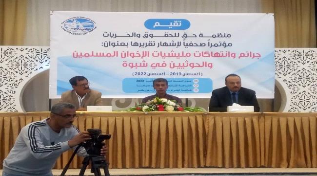 وكشفت منظمة حق في تقريرها الذي جاء بعنوان : ( جرائم وانتهاكات مليشيات الإخوان المسلمين والحوثيين في شبوة .. أغسطس ٢٠١٩ – أغسطس ٢٠٢٢ ) ، الذي أشهرته في مؤتمرها الصحفي المنعقد يوم السبت في العاصمة عدن ، أن محافظة شبوة شهدت خلال هذه الفترة آلاف الجرائم والاعتداءات والانتهاكات تنوعت بين جرائم القتل والإعدامات خارج القانون والاغتيالات ، والتعذيب الوحشي والاعتقال التعسفي والاخفاء القسري والتفجيرات واستهداف الحياة المدنية والمنشآت والمرافق الصحية والمدنية العامة والخاصة ومنازل المواطنين ، والتي ظلت ترتكب بشكل دائم في شبوة ، طوال فترة الثلاث سنوات ، من قبل سلطة ومليشيات حزب الإصلاح الإخواني والقوات والعناصر الإرهابية الموالية له في المحافظة ومليشيات الحوثيين.