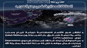 أكد مركز التنبؤات الجوية والإنذار المبكر في الهيئة العامة للطيران المدني والأرصاد، أن مخرجات التنبؤات العددية وصور الأقمار الاصطناعية تشير إلى دورانية للرياح وسحب ركامـية حملية على شرق بحر العرب وتكون منطقة ضغط جوي منخفض ( LPA )، تزداد شدتها إلى منخفض جوي Depression ويتحرك شمال موقعه خلال الـ48 ساعة القادمة بمشيئة االله تعالى.