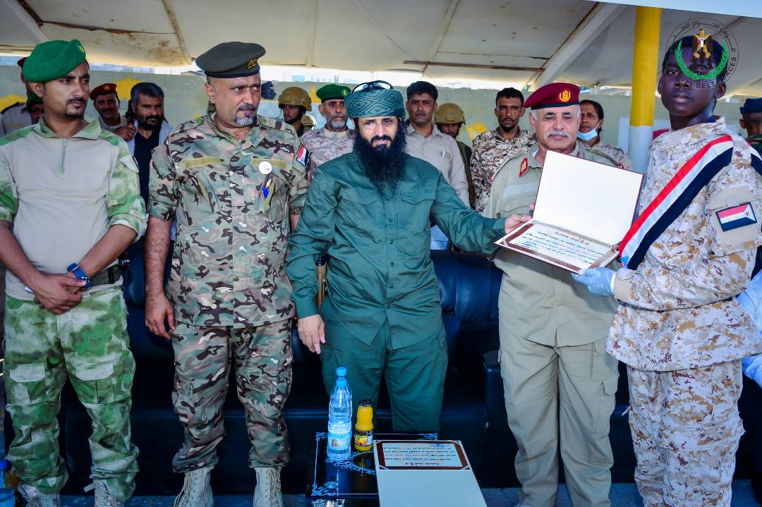وخلال الحفل الذي حضره عدد من القيادات العسكرية والأمنية يتقدمهم اللواء الركن علي البيشي قائد القوات البرية الجنوبية والعميد محسن الوالي القائد العام لقوات الحزام الأمني.