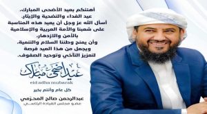 وفي منشور على صفحته الرسمية بمواقع التواصل الاجتماعي، مساء اليوم، قال القائد المحرّمي: “أهنئكم بعيد الأضحى المبارك، عيد الفداء والتضحية والإيثار”، سائلاً الله أن يعيد هذه المناسبة على شعبنا والأمة بالأمن والازدهار.