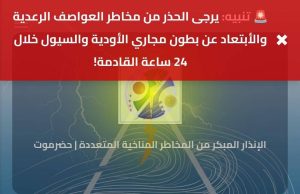 ومن المتوقع هطول أمطار متفاوتة بين المتوسطة والغزيرة، مع احتمالية تدفق السيول المحلية على بعض الأودية وفروعها، وقد أهاب مركز الإنذار المبكر بالمواطنين أخذ الحيطة والحذر أثناء هطول الأمطار، وعدم المجازفة في عبور الأودية، وشدد على رفع الممتلكات العامة والخاصة من مجاري الأودية وفروعها، وتجنب ملامسة أعمدة الإنارة أو الموصلات الكهربائية أثناء وبعد هطول الأمطار، والانتباه لانخفاض مستوى الرؤية الأفقية أثناء غزارة الأمطار في الطرقات أو تشكل الضباب.