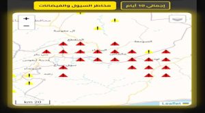 وأظهرت خرائط النظام تمركز مؤشرات الخطر في عدد من المديريات، مع تسجيل مستويات إنذار مرتفعة (باللون الأحمر) في بعض المناطق، ومستويات إنذار متوسطة (باللون الأصفر) في مناطق أخرى، ما يعكس احتمالية هطول أمطار غزيرة قد تؤدي إلى تشكل سيول جارفة.