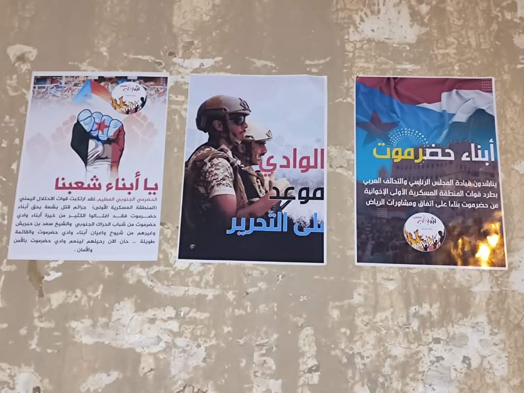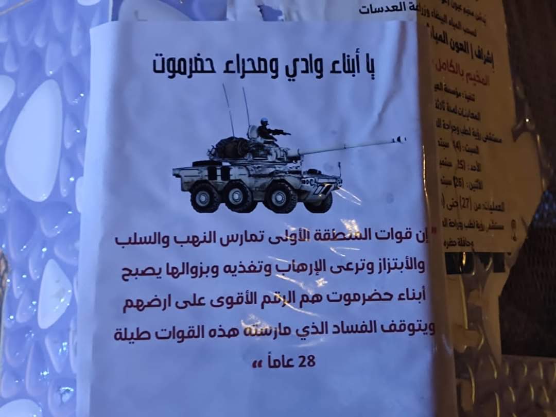 “إخراج قوات المنطقة العسكرية الأولى مطلبنا، والانتقالي يمثلنا، وتحرير الوادي مطلبنا، وبرع من حضرموت يا ابوعوجاء، والعمالقة قادمون، والنخبة مطلبنا” ؛ بالإضافة إلى شعارات الشكر لدولة الإمارات العربية المتحدة على دعمها لأبناء الجنوب ووقوفها ومساندتها لهم في أصعب الظروف.