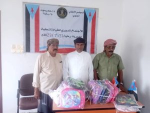 دشنت الهيئة التنفيذية للقيادة المحلية للمجلس الانتقالي الجنوبي في مديرية رخية بمحافظة حضرموت، اليوم الخميس، مشروع توزيع الحقيبة المدرسية على طلاب الصفوف الأول والثاني الثالث ابتدائي.