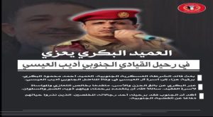 بعث قائد الشرطة العسكرية الجنوبية، العميد أحمد محمود البكري، برقية عزاء ومواساة إلى أسرة آل العيسي، في وفاة المناضل والقيادي في الحراك والمقاومة الجنوبية أديب العيسي، الذي انتقل إلى رحمة الله مساء الأربعاء إثر ذبحة صدرية مفاجئة.