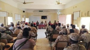 وبيّن العقيد الجهوري أهمية ودور التوجيه المعنوي في رفع الروح القتالية والمعنوية لأفراد القوات المسلحة، مؤكدًا أن التوجيه ليس مصطلحًا أو شعارًا مطاطيًا أجوفًا، بل هو عمل ميداني وفكري وسياسي ملموس، يقود إلى نتائج لا بد أن تتحقق وتثمر في الميدان.