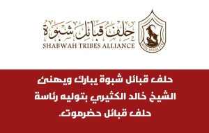بعث حلف قبائل شبوة بقيادة الشيخ فارس بن ناصر الخبيلي بلعبيد برقية تهنئة ومباركة للشيخ خالد الكثيري بمناسبة إجماع وتوافق قبائل حضرموت على منحه ثقة رئاسة حلف قبائل حضرموت.