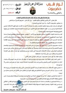 وعليه، فإننا في “ثوار شباب حضرموت”، ومن قلب الميادين، نعلن الآتي: