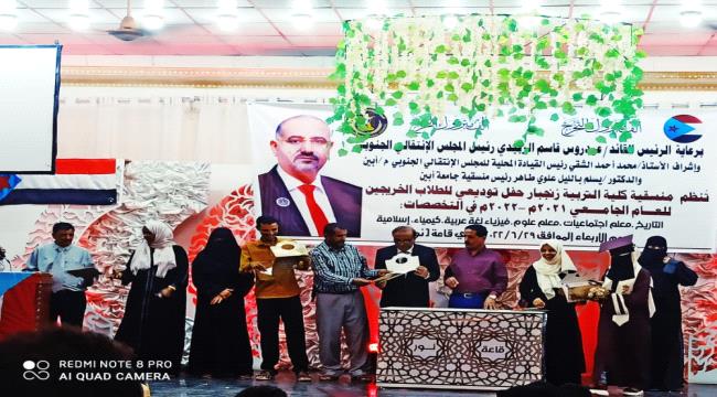 برعاية الرئيس عيدروس الزبيدي رئيس المجلس الانتقالي الجنوبي، شهدت مديرية زنجبار عاصمة ابين اليوم، حفلاً توديعيا لـ 96 طالبا وطالبة من كلية التربية زنجبار للعام 2021- 2022م في كلأ من التخصصات التاليه ،الاجتماعيات، التاريخ، العلوم، الفيزياء، اللغه العربية، الإسلامية، الكيمياء، وذلك بحضور رئيس الهيئة التنفيذية للقيادة المحلية بالمجلس الانتقالي بمحافظة أبين الاستاذ محمد احمد حيدرة الشقي، ونائبه الاستاذ خالد عمر العبد، ورئيس منسقية المجلس الانتقالي بجامعة أبين الدكتور يسلم بالليل.وعددا من أعضاء الجمعية الوطنية والهيئة التنفيذية بالمحافظة، ورؤساء المنسقيات والأكاديميين بالجامعة.