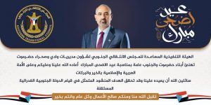 كما ترفع الهيئة تهانيها العميقة لرئيس القيادة المحلية للمجلس الانتقالي الجنوبي بمحافظة حضرموت العميد الركن/ سعيد أحمد المحمدي ولكافة مواطني حضرموت والجنوب بمناسبة حلول عيد الأضحى المبارك أعاده الله علينا وعليهم بالأمن والأمان والاستقرار.