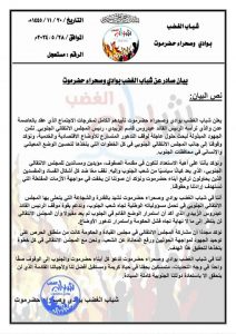 أننا في شباب الغضب بوادي وصحراء حضرموت ندعو كل أبناء حضرموت والجنوب إلى الوقوف صفًا واحدًا في وجه التحديات، متمسكين بحقنا في حياة كريمة ومستقبل أفضل لنا ولأجيالنا القادمة الذي لن يتحقق الا باستعادة دولتنا الجنوبية كاملة السيادة.