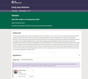 أورد البرلمان البريطاني مذكرة للحديث عن الوضع العام في اليمن، وقراءة تسلط الضوء على أبرز القضايا على الساحة المحلية وأهمها وأولها الاعتراف بقضية شعب الجنوب كقضية أساسية وجوهرية لأي سلام قادم، وأكدت المذكرة على الاعتراف بالوضع التاريخي للجنوب والتطلعات الدائمة لشعبنا ، والاعتراف بحق الجنوبيين في تقرير مصيرهم.