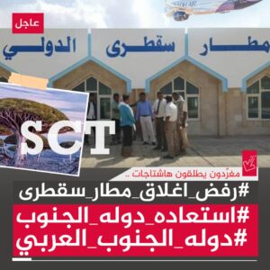 كما دعا السياسيون النشطاء كافة رواد منصات التواصل الاجتماعي إلى التفاعل مع هاشتاج #رفض_اغلاق_مطار_سقطرى و #دوله_الجنوب_العربي و #استعاده_دوله_الجنوب .