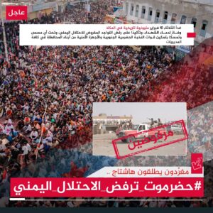 أطلق مغردون جنوبيون، اليوم الاثنين، هاشتاج حضرموت ترفض الاحتلال اليمني، تزامنا مع حملة قمع واعتقالات تعسفية تطال متظاهرين سلميين شاركوا في مسيرة جماهيرية قبل 3 أيام في سيئون.