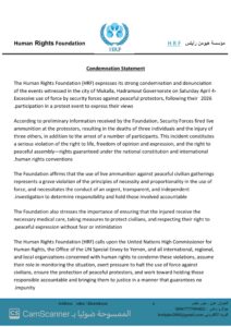 وبحسب المعلومات الأولية التي أوردتها المؤسسة في بيانها، فقد أقدمت قوات الأمن على إطلاق الرصاص الحي باتجاه المحتجين، مما أسفر عن سقوط ثلاثة قتلى وثلاثة جرحى، فضلاً عن اعتقال عدد من المشاركين. ووصفت المؤسسة هذه الواقعة بأنها انتهاك خطير للحق في الحياة، وحرية الرأي والتعبير، والحق في التجمع السلمي، وهي حقوق تكفلها الدساتير الوطنية والاتفاقيات الدولية.