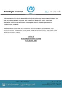 أعربت “مؤسسة هيومن رايتس” (HRF) في بيان رسمي عن إدانتها واستنكارها الشديدين لاستخدام قوات الأمن القوة المفرطة ضد المتظاهرين السلميين في مدينة المكلا بمحافظة حضرموت، وذلك على خلفية مشاركتهم في فعالية احتجاجية للتعبير عن آرائهم.