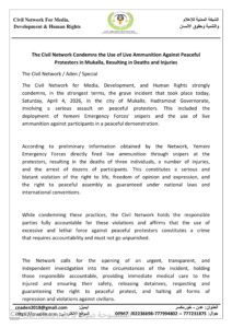 أدانت “الشبكة المدنية للإعلام والتنمية وحقوق الإنسان” بأشد العبارات الاعتداء الخطير الذي طال المتظاهرين السلميين في مدينة المكلا بمحافظة حضرموت يوم السبت 4 أبريل 2026، إثر قيام قوات الطوارئ اليمنية باستخدام الرصاص الحي لفض مظاهرة سلمية.