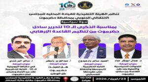 وتُعقد الندوة في تمام الساعة العاشرة صباحاً بقاعة مقر الهيئة التنفيذية للمجلس في محافظة حضرموت، مقابل منارة المحضار، وسط توقعات بحضور رسمي ومجتمعي واسع.
